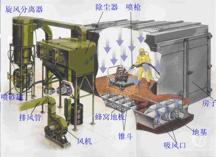 氣力回收噴砂房剖析圖           蜂窩地漏示意圖